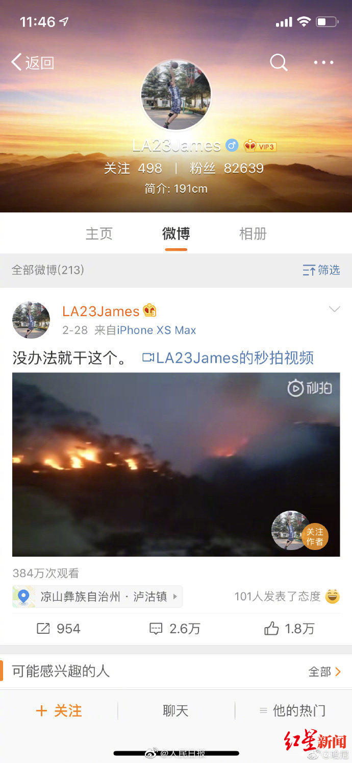 8月10日,红星新闻记者看到,刘代旭的烈士的微博@LA23James已经有8.7万粉丝,他的最后一条微博定格在了2月28日,画面是他们扑火的视频,目前已经有超过419万人观看,有超过3万人评论,2.3万人点赞。