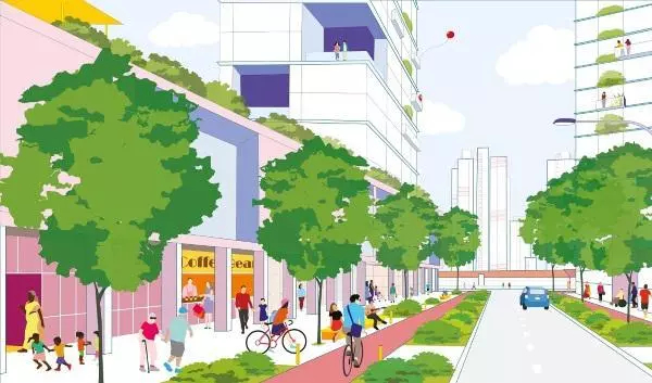 同时改善主要街道的街景,创造更有吸引力、出行友善和更生态的街道, 通过沿街道布置商店、餐馆和公共服务设施,方便行人在下班回家途中享受快捷的购物及咖啡体验。