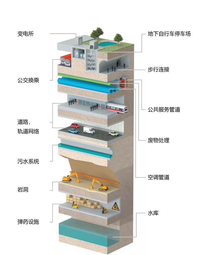 规划草案中发布的地下3D规划图纸也透露出新加坡深化地下空间开发的另一个趋势,将公共设施、交通运输、仓储和工业设施迁入地下,释放更多空间给市民。