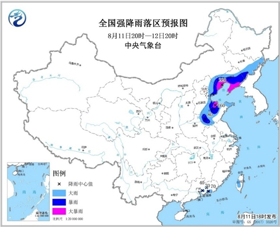 中央气象台预计,受“利奇马”影响,11日20时至12日20时,山东中西部和半岛北部、河北东部、天津大部、辽宁大部、吉林东部等地有大到暴雨,其中,山东北部、河北东北部、辽宁南部等地的部分地区有大暴雨(100~220毫米)。
