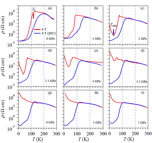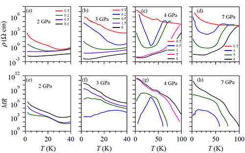 图1. 在不同压力下n型HgCr2Se4单晶在0T与8T磁场下的电阻率-温度曲线