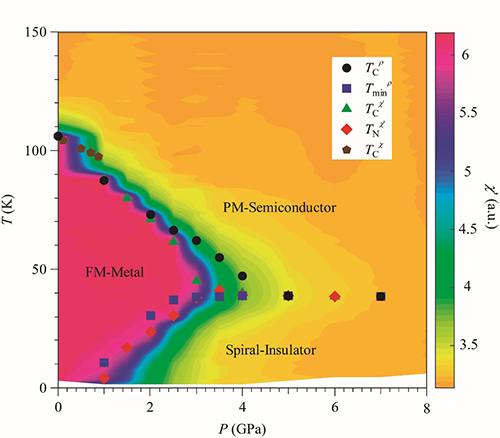 EX6组的孙建平、焦媛媛、程金光与EX1组的伊长江、石友国、纳米物理与器件重点实验室的李永庆、凝聚态理论与材料计算重点实验室的方忠,联合美国橡树岭国家实验室博士M. Matsuda和日本东京大学教授Y. Uwatoko等合作者,采用六面砧大腔体高压低温物性测量装置,在8 GPa静水压、1.5 K最低温和8T磁场的综合极端环境下,对高质量的n型HgCr2Se4单晶开展了细致的高压下电输运和磁性测量,发现其铁磁金属基态在压力下逐渐转变为螺旋反铁磁绝缘态,而通过施加磁场可以恢复铁磁金属基态,从而导致低温出现了高达3×1011%的庞磁电阻。