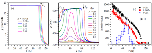 图3. n型HgCr2Se4单晶在不同压力下的直流磁化率、交流磁化率以及中子衍射峰强度随温度的依赖关系