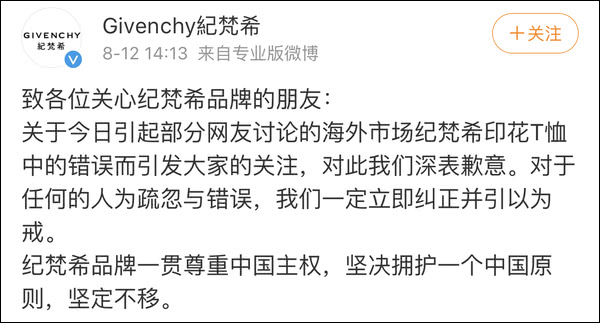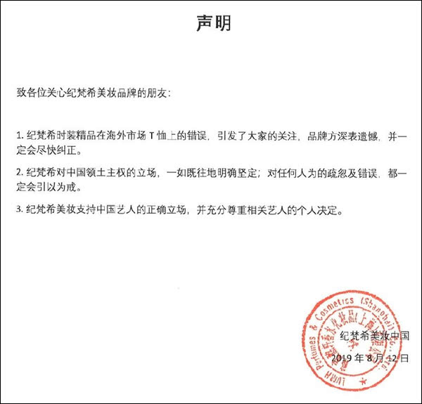 下午,“纪梵希”和“纪梵希美妆”同时发布道歉声明,均表示尊重中国主权,坚决拥护一个中国原则。