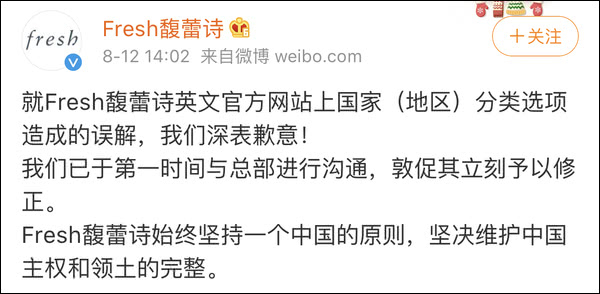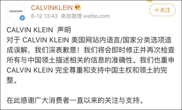 继奢侈品牌“范思哲(Versace)”、“蔻驰(Coach)”后,“纪梵希(Givenchy)”、“亚瑟士(asics)”、“馥蕾诗(fresh)”和“Calvin Klein”等国际品牌,今日(12日)先后被网友爆出产品或官网存在“中国港台地区列为国家”的问题。