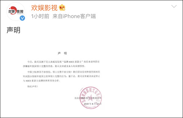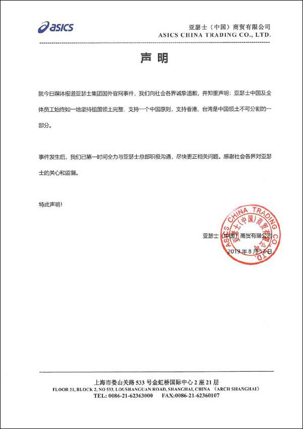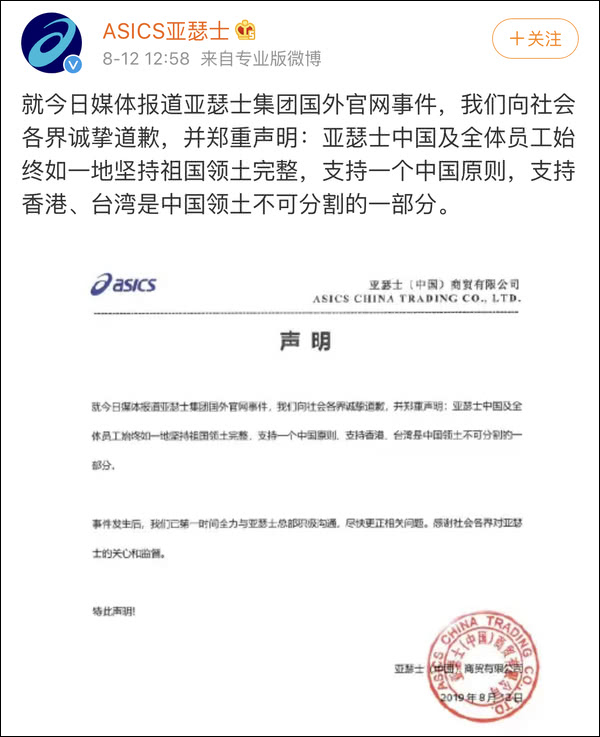 @ASICS亚瑟士 中午发布道歉声明。