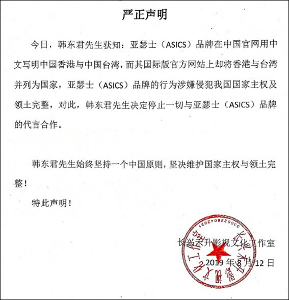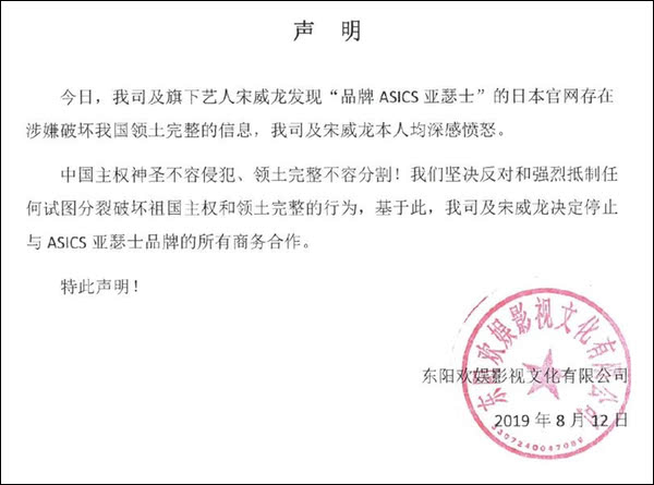 两名品牌代言人,大陆男演员韩东君和宋威龙,先后通过经纪公司发布解约声明。