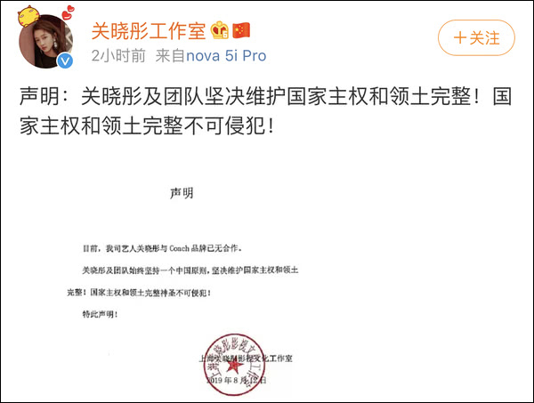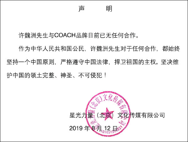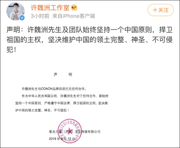 此后蔻驰的上一季代言人,大陆演员许魏洲、任嘉伦、关晓彤也分别发布声明宣布与品牌已无合作内容。