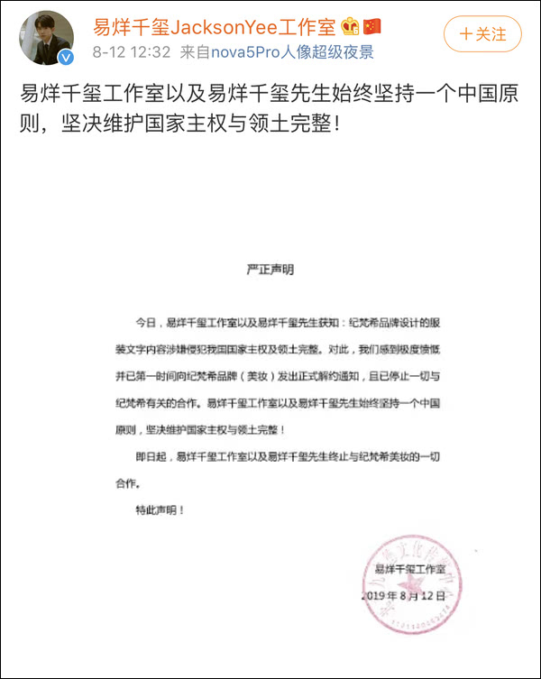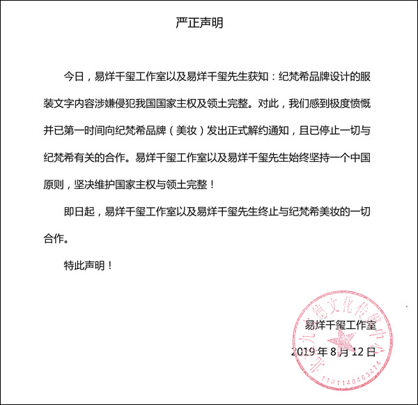 声明表示,在获知纪梵希品牌设计的服装文字内容涉嫌侵犯中国国家主权及领土完整后,工作室已第一时间向纪梵希品牌(美妆)发出正式解约通知,且已暂停一切与纪梵希有关的合作,并表示坚决维护国家主权与领土完整。