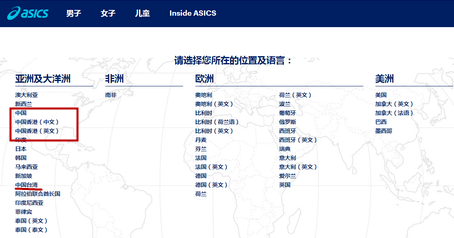 亚瑟士国际版官方首页,在“choose your country(选择你的国家)”的下拉列表中,亚洲分区中中国港台地区特备列为国家。
