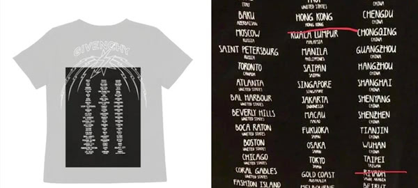 纪梵希的这款闪电印花图案的T恤,也和范思哲、蔻驰一样,将中国香港、台湾地区以与其他国家并列的形式印制在T恤背面,被中国网友怒骂不尊重我国国家主权。