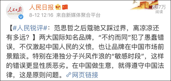 @人民日报 发表微评对这些品牌严厉批评,“果真有善意和敬畏之心,就不应动辄伤害中国人民的感情;如果真正汲取教训,也不至于“排队”似的在港澳台问题上乱做文章。面对不守规矩的跨国企业,我们除了谴责,也该从“工具箱”里拿出点自卫工具。”