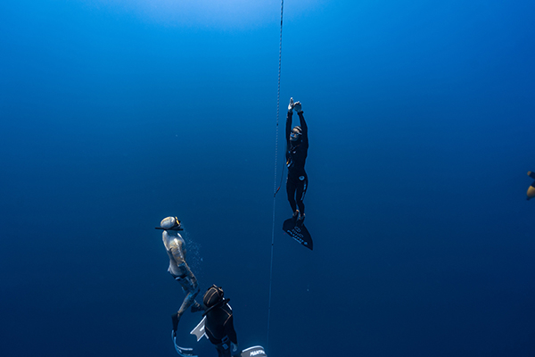 自由潜水的潜水者不带氧气瓶,只屏住一口气,潜入水下身体极限所能维持的深度,再用单程呼吸的氧气安全返回水面。深海的孤独和随时可能面临的窒息恐惧让《福布斯》杂志将其称为“世界上第二危险的运动,仅次于低空跳伞”。