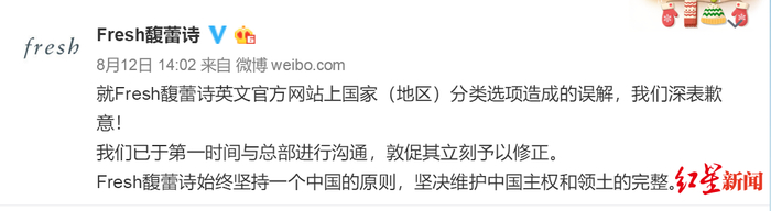 红星新闻记者发现,在此次事件中,各涉事品牌道歉声明来的可谓是“火速”。其中,fresh馥蕾诗昨日13时20分左右被网友曝出英文官网国家分类存在问题。14:02分其官方微博就发布致歉声明,表示就Fresh馥蕾诗英文官方网站上国家(地区)分类选项造成的误解,深表歉意!前后不到一小时。而纪梵希等品牌也是在被曝出问题后,短短几小时内就迅速做出回应。