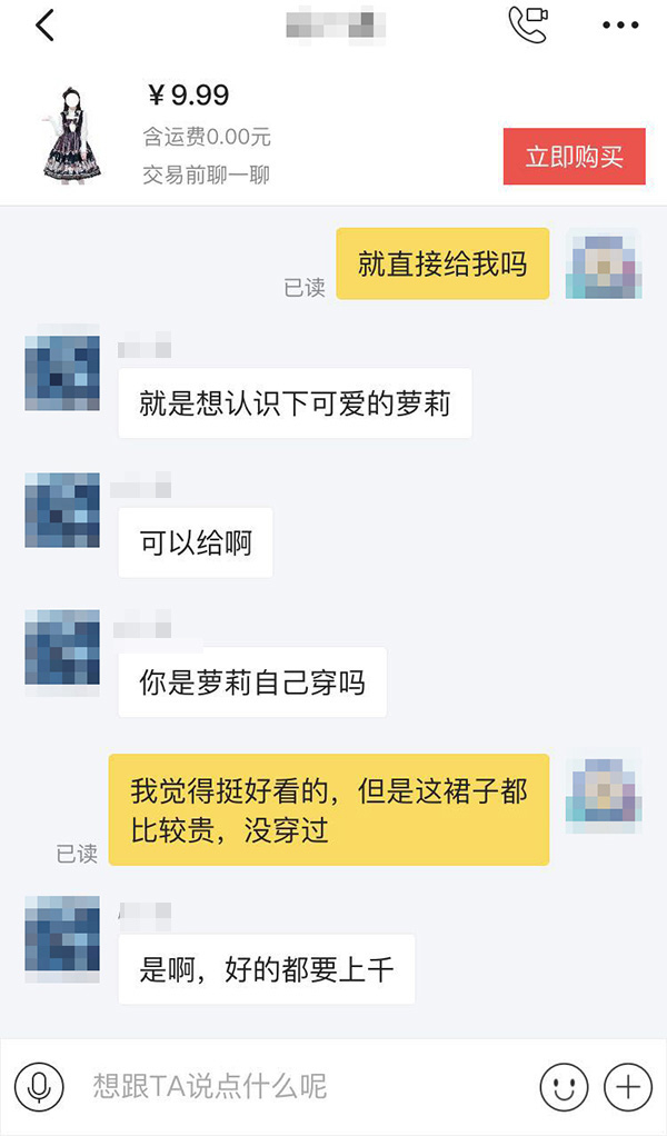 小贝在商品介绍处写道,今年4月26日,她在闲鱼上看到超低价出售的裙子,出于好奇,她点进去和卖家“y时光又不在”聊了聊,结果卖家要求小贝“五一”假期过去陪他玩几天,并明确提出“上床”要求。小贝这才明白对方企图,连忙结束了对话。