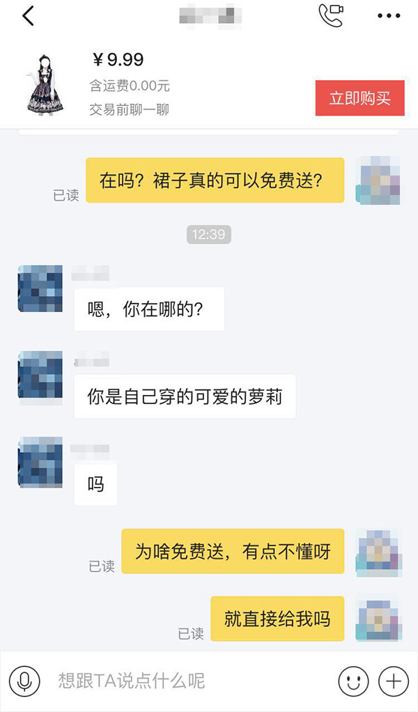 当被问到为什么不要钱免费送裙子时,该卖家声称只是为了“认识可爱的萝莉”,随即又说出“想你穿上这衣服陪陪我,我可以满足你很多”等露骨话语。