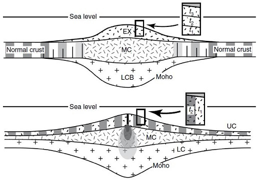 大塔穆火山形成机制对比示意图,火山脉冲式喷发模式(上)、海底扩张模式(下)。最新研究成果发现该火山具有显著的条带状磁异常特征,符合海底扩张模式