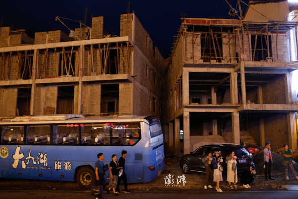 2019年8月4日,湖北省神农架坪阡镇,一辆旅游大巴和自驾游车辆停在两栋还没竣工的楼房前。随着神农架旅游旺季到来,众多游客涌入遍地民宿餐饮的坪阡镇避暑游玩。