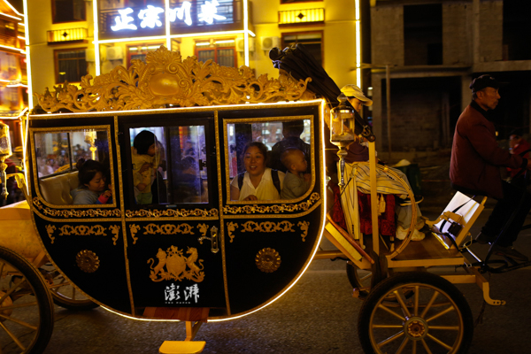 2019年8月4日,湖北省神农架坪阡镇,一位坐在欧式马车里的游客向外张望。随着神农架旅游旺季到来,众多游客自驾涌入大九湖坪阡镇避暑游玩。