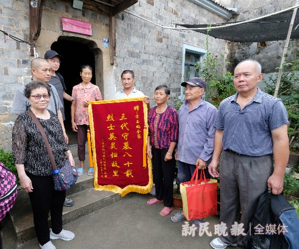 祭扫结束后,张洁亚烈士的亲人们又专程登门拜访了守墓人宋峰其家,并向宋家赠送了一面在上海就做好了的锦旗:“三代守墓八十载,烈士英灵归故里”。向志愿者胡食万赠送的锦旗上,写着“为烈士寻找亲人,为时代铸就军魂”。两面锦旗的字里行间,透着满满的感动与谢意。福寿园新四军广场也向宋家赠送了一枚新四军臂章。