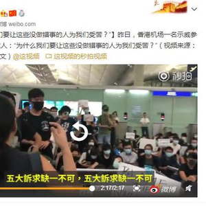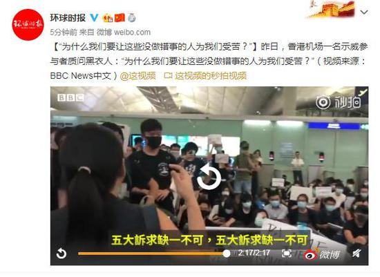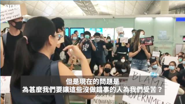 [“为什么我们要让这些没做错事的人为我们受苦?”]昨日,香港机场一名示威参与者质问黑衣人:“为什么我们要让这些没做错事的人为我们受苦?”