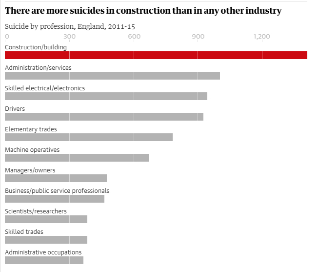 在一个男性占绝大多数的环境中(85%以上的建筑工人是男性),造成这种现象的因素包括欺凌、思乡、工作不安全感、经济压力和孤立感,有时还会因饮酒、吸毒和赌博而加剧。此外,该行业被分散到各个层级的分包商中,这些分包商争相赚取微薄的利润。因此,即使一家主要的分包商有保护工人的崇高抱负,也影响不了整个供应链。