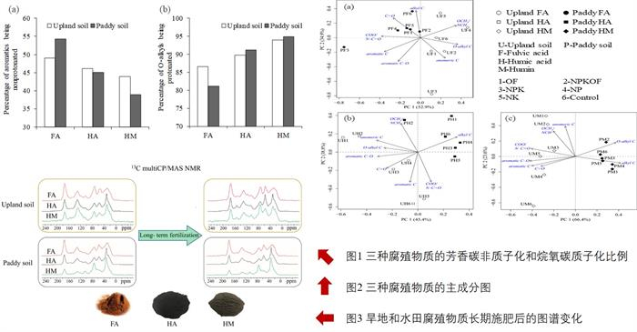 中国科学院南京土壤研究所赵炳梓课题组利用封丘站和桃源站的长期肥料试验为平台,采用高级核磁共振技术深入研究了不同施肥管理模式对两种不同类型土壤(旱地和水田)中富里酸、胡敏酸和胡敏素结构特征的影响。研究发现三种腐殖质的结构并不相同。富里酸除了表现出结构上的相对活性特征外(即文献多次报道的COO/N–C=O结构),其芳香碳大部分均为非质子形态(图1),证明了其结构中的惰性。胡敏酸在三种腐殖物质中表现出相对更高的芳香度特征。而胡敏素中则含有大量的脂肪族结构。主成分分析结果表明旱地和水田的腐殖物质结构差异明显(图2),尤其是旱地胡敏素的芳香度明显高于水田胡敏素。施肥管理措施对两种土壤腐殖物质结构的影响也不同(图3),水稻土腐殖物质结构整体上变化不大,而旱地潮土则表现出明显的结构差异,尤其是胡敏素结构,施肥尤其是有机肥降低了其芳香性。以上结果表明,腐殖物质组分及其结构对土壤环境和土壤管理措施都有适当的反馈,这显然与腐殖物质仅仅是实验室产物而非真实存在的观点相悖。
