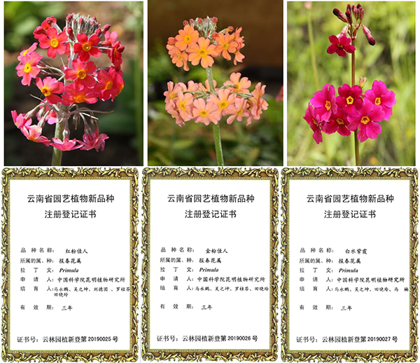 最后,团队对这些遗传背景清晰、引种成功的杂交后代建立了观赏性状评价体系;筛选出了观赏性状突出、具有广泛园艺利用前景的天然杂交后代单株;突破了这些优良单株的高效营养繁殖技术;掌握了其高效集成栽培技术。近日通过了报春花新品种的评审并获得了3个云南省园艺植物新品种授权证书。分别是橘红灯台报春和霞红灯台报春的天然杂交后代“红粉佳人”和“金粉佳人”,以及茴香灯台报春与海仙花的天然杂交后代“白水紫霞”。