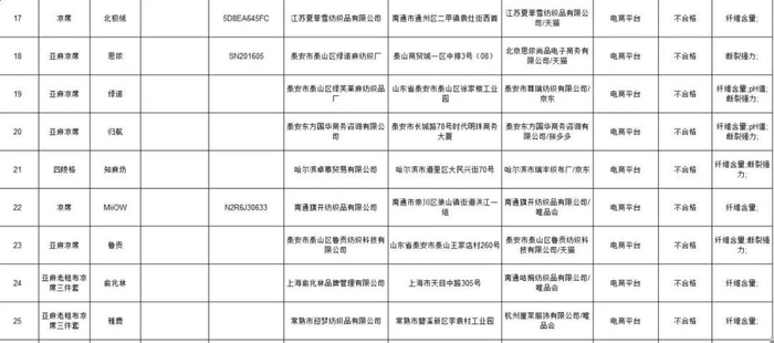 从此次抽查的结果来看,竹席不合格项目为甲醛含量和竹条韧性;皮凉席产品不合格项目为摩擦色牢度;亚麻凉席和再生纤维素纤维凉席产品不合格项目为纤维含量、pH值和断裂强力。尤其值得一提的是,本次抽查中发现有19批次亚麻凉席和再生纤维素纤维凉席产品的纤维含量不合格,标注纤维名称及含量与实际不符。断裂强力是衡量织物使用耐久性的一个重要物理指标,断裂强力差的产品,在使用中易被损坏,影响使用寿命。本次抽查中发现有14批次亚麻凉席和再生纤维素纤维凉席产品的断裂强力不合格。