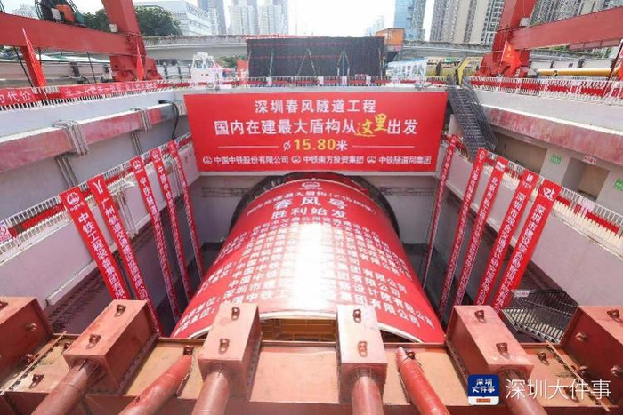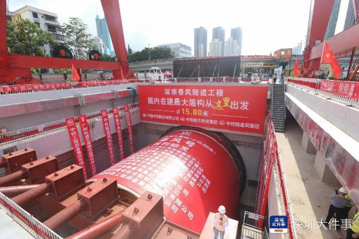 春风隧道是深圳市首条采用盾构法施工的市政公路隧道,也是国内目前在建直径最大的盾构隧道项目,盾构机“总长135米、开挖直径15.8米,总重量达到4800多吨,“春风号”总功率超过1.15万千瓦,比“复兴号”高铁的总牵引动力高10%;推力高达2.46万吨,是我国最大运载火箭“长征五号”的24倍左右。