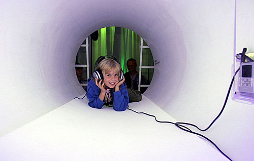 2005年9月3日,在德国的柏林国际消费电子展上,小观众在试听索尼公司生产的新款随身听。(新华社)