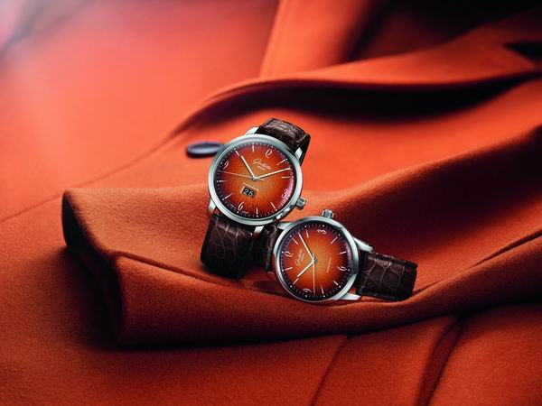 全新橙色 Sixties 六零年代腕表外观承袭这个系列标志性的曲面设计,阿拉伯数字、钻石切割时标、手工压嵌小时时标以及 Super-LumiNova 夜光指针都是和谐匹配的点缀。从中心到边缘,从金黄色到火橙色、红色,再到最外围的黑色——细腻的色彩层次在曲面表盘上徐徐展开,自然流畅。而这种渐变的迷人色彩组合的实现要归功于 Glashütte Original 格拉苏蒂原创普福尔茨海姆 (Pforzheim) 自有表盘厂的专家们。在通过电镀工艺赋予表盘黄金色调之后,表盘师会小心谨慎地涂覆一层又一层红漆和黑漆,最终打造出别具特色的颜色渐变效果,令每一枚表盘都独一无二。