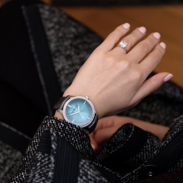 在38 毫米直径表壳内,搭载了湖水蓝色的渐变色表盘。深邃迷人的湖水蓝表盘与表壳外圈镶嵌的璀璨钻石交相辉映,更添几分浪漫。表盘上简约的时标和叶形指针,承袭了亨利慕时素来青睐的极简主义美学风格。