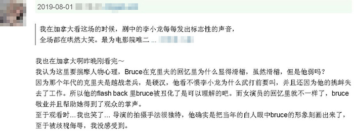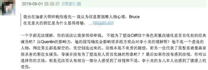 围绕这一话题的孰是孰非,媒体与观众也分成了两派,有力挺艺术创作自由的,有认定昆汀一直都是李小龙忠实粉丝的(最好的例子,莫过于《杀死比尔》中乌玛·瑟曼身着的那一套向李小龙致敬的黄色功夫衫),也有认定李小龙是不可能输给区区一个好莱坞替身演员的,甚至还有将整个问题上纲上线至昆汀“辱华”程度的。就连在豆瓣上,针对这一场在整部影片中只占几分钟的戏,也已有了热烈争论,同样持不同观点者势不两立。