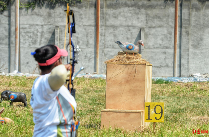 上午9点过,本届世警会的3D射箭比赛在四川省陆上运动学校开赛。与一般射箭比赛的靶不同,3D射箭项目的靶子是动物模型。红星新闻记者在现场注意到,场地里不同位置摆放了兔子、鹿、鸭子、猪等猎物的模型,模型身上有蓝色、红色、黄色的区域,“射中不同颜色的部位的得分不一样。”一位裁判介绍。