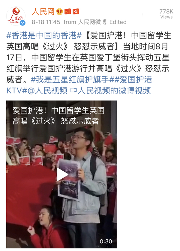 据@人民网 8月18日报道,当地时间8月17日,在英国爱丁堡街头,中国留学生挥舞五星红旗,举行“爱国护港”游行时,合唱起了张信哲经典歌曲《过火》并怒怼示威者。