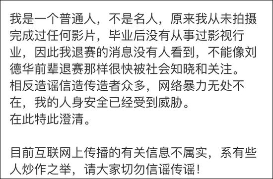 她还写道,造谣信谣者众多,网络暴力无处不在,她的人身安全已经受到威胁。并称目前互联网上传播的有关信息不属实,系有些人炒作之举。