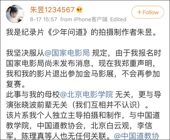 8月17日,@朱昱1234567 在微博发文称,由于其报名参加金马影展时国家电影局尚未发布消息,所以“现在我郑重声明,我和我的影片退出参加金马影展,不会再参加复赛”。