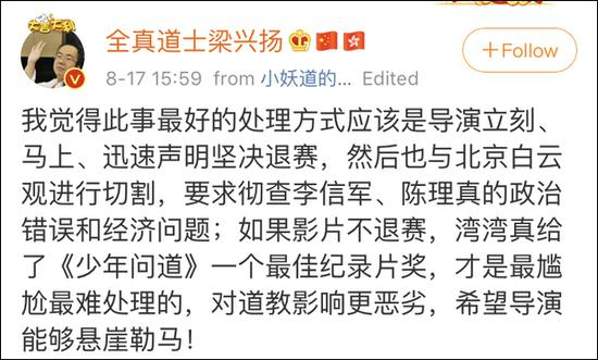 此前,有台湾媒体报道称,在国家电影局发布相关通知后,大陆纪录片《少年问道》“一本初衷坚持不退赛”,是“目前唯一公开表态参赛的大陆影片”。随后大V@全真道士梁兴扬 在微博多次指责该片,但均未得到片方关于是否参赛的正式回应。