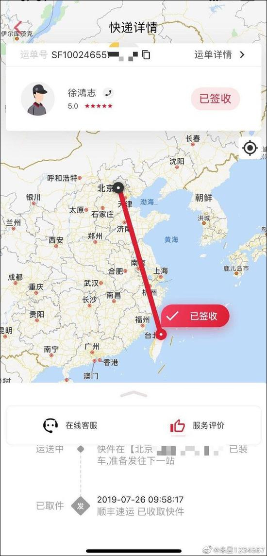 @朱昱1234567 随文贴出了一张快递截图,显示自己曾有一个从北京寄往台北的快递在7月26日被签收,但并未就快递详情给出解释。