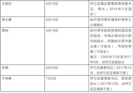 除前文中提到朱辉、于传勇和孙绍文三人外,高岩曾任呼兰区副区长,其余官员长期在呼兰区环保、住建、城管、国土、税务部门担任一把手正职或副职。