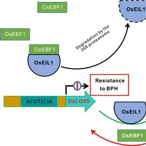 乙烯(Ethylene,ET)和茉莉酸(Jasmonic acid,JA)信号传导途径在介导植物响应生物胁迫的过程中发挥着重要作用,两种信号途径在介导植物抗病过程中的相互应答也多有揭示。在植物抵御刺吸式昆虫取食的过程中,ET和JA之间是否存在相互作用,以及相互作用的机理如何,尚缺乏研究。褐飞虱是以刺吸式的方式专一性取食水稻的害虫,对水稻生产危害严重。遗传分析表明,ET信号途径的信号分子,OsEBF1和OsEIL1分别正调控和负调控水稻抗褐飞虱。分子和生化分析表明,二者之间存在直接的相互作用,OsEBF1能够通过泛素化途径介导OsEIL1的降解,说明ET信号途径负调控水稻抗褐飞虱。RNA-seq的数据表明,oseil1突变体中JA信号途径的基因OsLOX9,被显著下调。生化分析证明了OsEIL1蛋白对OsLOX9基因的直接转录调控。研究揭示了JA和ET信号途径协同负调控水稻对刺吸式昆虫的抗性,OsEIL1蛋白对OsLOX9基因的直接转录调控介导了二者的协同性。OsEIL1-OsLOX9是介导ET和JA信号途径相互应答的新的信号交叉位点。