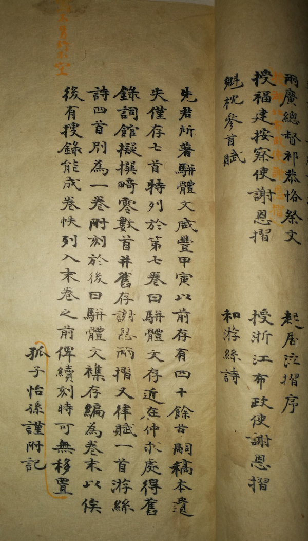 我所收藏的这部《枫南山馆遗集》,就是庄怡孙当年要为父刊刻文集之时,根据家藏的各种原始资料亲笔抄写整理的。这种形式的写本,有别于作者亲手书写的原稿,一般称为清稿本。此本旧装一函两册全,蓝绫面金镶玉装,有“毗陵庄氏”“手泽仅存子孙永保”“庄炎审定”等藏印,知此书曾长期为庄氏后人珍藏,不知何时散出。书中受祺之名讳均用黄笔填写,并于多处自署“孤子怡孙谨附记”“孤子怡孙编次”“子怡孙编次”。全文书写工整,书法流利精彩,功底深厚,经与庄怡孙现存书法作品比较,为怡孙亲笔无疑。庄怡孙光绪间曾任刑部郎中,以工书名于世,《国朝书画家笔录》卷四有传。