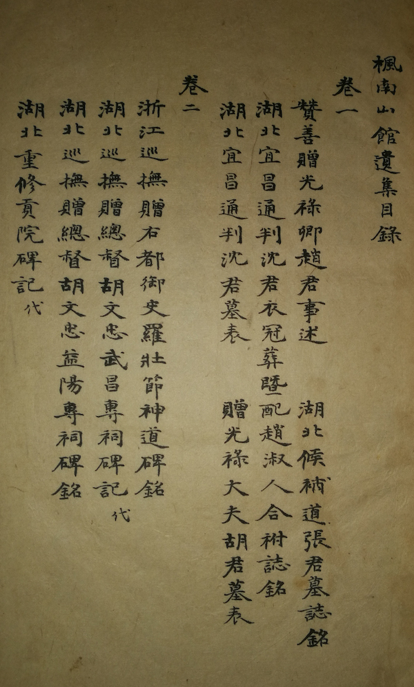 此书共正文七卷,卷末附骈体文杂存一卷,其中卷五为“湖北兵事述略”。全书目录及内文多有校改,如骈体文杂存目录以黄笔增补“授湖北布政使谢恩折”一篇,此折原稿本正文失收,于卷尾另贴一纸增入,并注明“抬写及空格写处均应查照闽臬浙藩折以归一律”,此乃针对原文中的“授福建按察使谢恩折”和“授浙江布政使谢恩折”所作的具体刊刻指示。目录原文后有庄怡孙附记,其中“近在仲求处得旧录词馆拟撰畸零数首并旧存谢恩两折”云云,就是指“闽臬浙藩”这两篇,湖北布政使谢恩折一篇则是后来又增入的,若不得此稿本,则不可能知道全书编辑的这些经过,这就是稿本的可贵之处了。卷尾又粘贴一纸,对刊刻校对做出了多处具体指示,如说“四卷六页五行胡母陈太夫人寿序,署应改暑”,“五卷十页八行兵事述略,雷以诚改諴”等。按,雷以諴为清代名臣,道光三年进士,曾在扬州帮办军务。这两处错字均当为形近致误。查此稿本,两字均不误,这两个错误肯定是刻版中出现的。因为手边没有这个刻本,未能全文一一对照,不知是否在刊刻过程中还有更多改动,好在此刻流传尚多,以后不难找来对校一遍。
