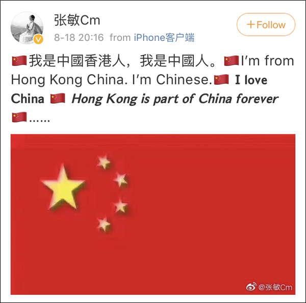 昨(18日)晚20时16分,香港影星@张敏Cm 用中英双语在微博发文,参与“爱国护港”活动。