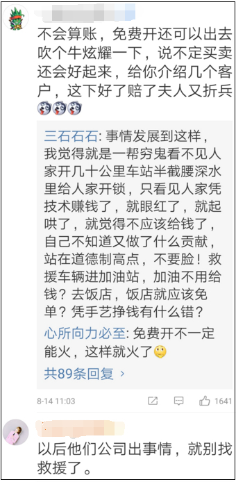 但更多网民对马师傅的做法表示同情和理解,认为锁匠也不容易,凭劳动挣钱,考虑到当时路途遥远,收费300元没有多要。