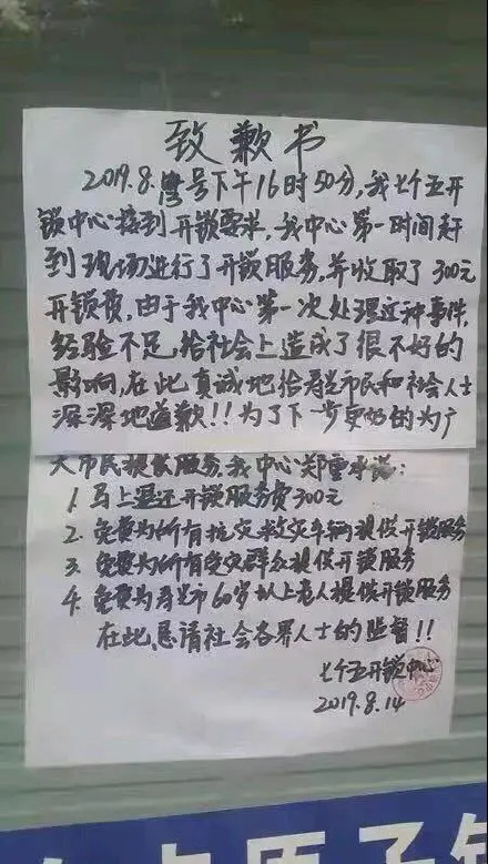 同一天,马师傅公开致歉,称事件系由于自己经验不足所致,表示马上退还300元开锁费,并承诺将为救援车辆及受灾群众免费开锁。