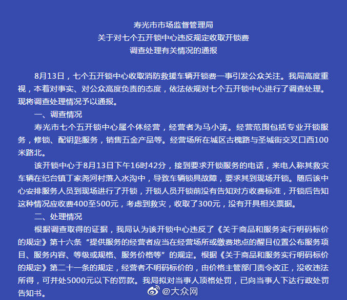 在被寿光市市场监督管理局处以5000元顶格罚款、并退款开锁费后,马师傅公开致歉,并承诺将为救援车辆及受灾群众免费开锁。