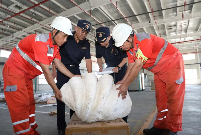 8月7日,天津海关所属新港海关关员在对一名中国籍旅客由印度尼西亚运送回国的行李中,查获濒危动物砗磲标本1件,重达120斤。