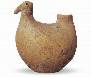 西藏昌都地区的卡若遗址,发现了距今五千年至四千年的新石器时代文化。在卡 若遗址中发现了两件彩陶,以彩绘纹与划线纹相间为特色。其中一件为变体鸟形彩陶罐,造型奇特,以曲折纹表示鸟身上的羽毛,具有象征意味。